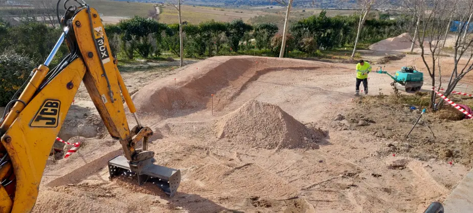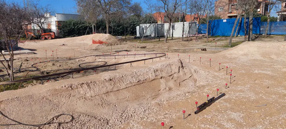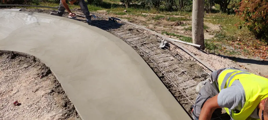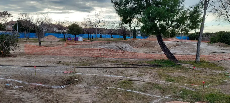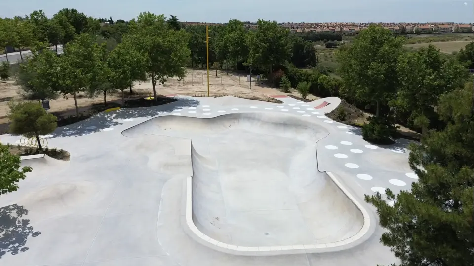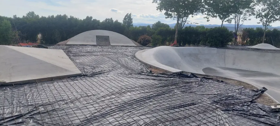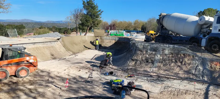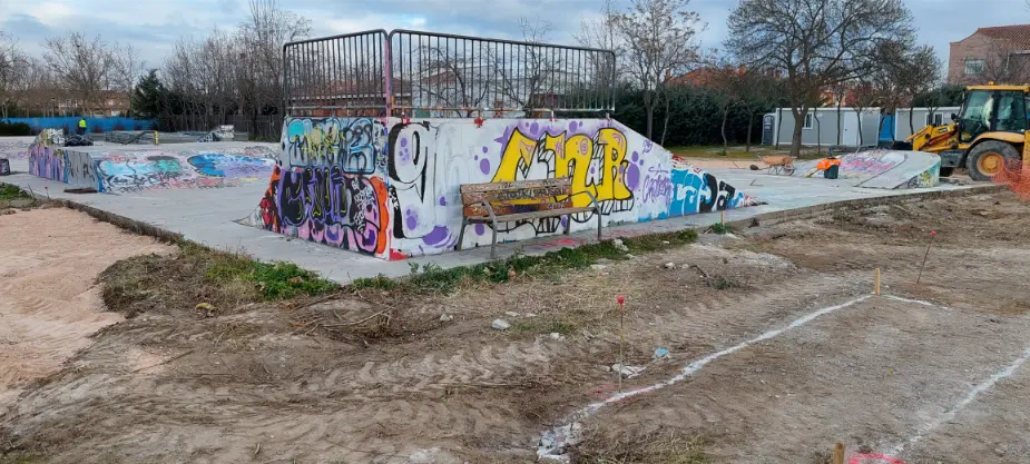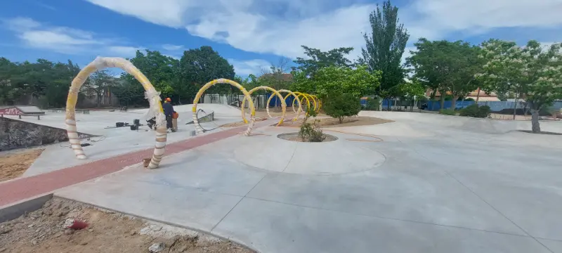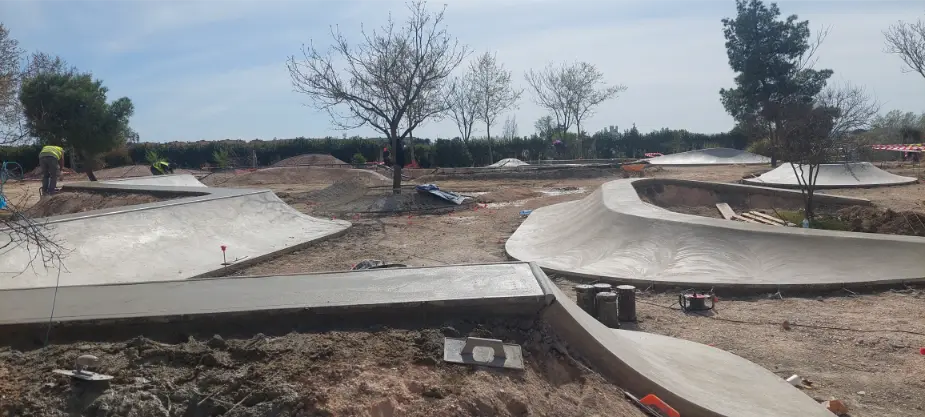 Para la renovación de esta área de patinaje se ha elegido un sistema constructivo que asegure resistencia, durabilidad y comodidad de uso. En las superficies horizontales, se ha optado por una solera de hormigón pulido mecánicamente, lo que proporciona un acabado liso y uniforme, ideal para facilitar el deslizamiento y los trucos de skaters y patinadores. En las zonas curvas, se ha aplicado hormigón gunitado con un pulido manual. Este proceso permite moldear el hormigón de manera precisa, garantizando transiciones suaves y seguras para la práctica de maniobras más técnicas. Además, el método de proyección y pulido confiere al parque una mayor resistencia y un acabado de calidad, clave para el disfrute de los usuarios y la conservación de las instalaciones a largo plazo.